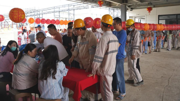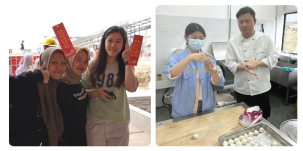 元宵佳節,莫羅瓦利產業基地食堂門前張燈結彩,160張燈謎紙條整齊劃一地懸掛在燈籠下面。來自基地各個部門的中印尼員工互相探討燈謎謎底。微風吹來,謎面隨風起舞,兩國員工穿梭其間,流連忘返。猜謎結束后,大家紛紛入座食堂,共享元宵。