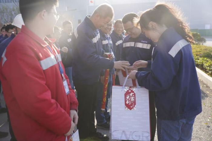 上午9點(diǎn),中偉銅仁(上市主體)產(chǎn)業(yè)基地總經(jīng)理趙能華走進(jìn)基地各部門工作場(chǎng)地,為兩千多名正投入新春第一天工作中的員工送上開工紅包,寓意新年“開門紅”,并祝愿大家龍年大吉、宏圖大展。
